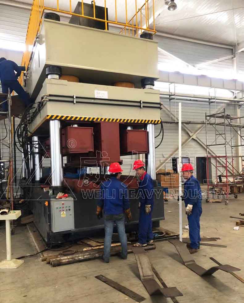2800噸波紋鋼腹板冷壓成型液壓機(jī)所有安裝工作完畢后,必須進(jìn)行現(xiàn)場(chǎng)調(diào)試。按下啟動(dòng)按鈕,看液壓機(jī)是否能夠順序的完成各工況動(dòng)作。調(diào)試過(guò)程中通過(guò)看、聽(tīng)等方式看液壓機(jī)硬件或控制系統(tǒng)工作是否正常。除此之外,還要檢驗(yàn)所有控制按鈕、壓力表是否都能正常工作。調(diào)試一段時(shí)間后,如果運(yùn)行正常,液壓機(jī)就可以正式交付使用了。